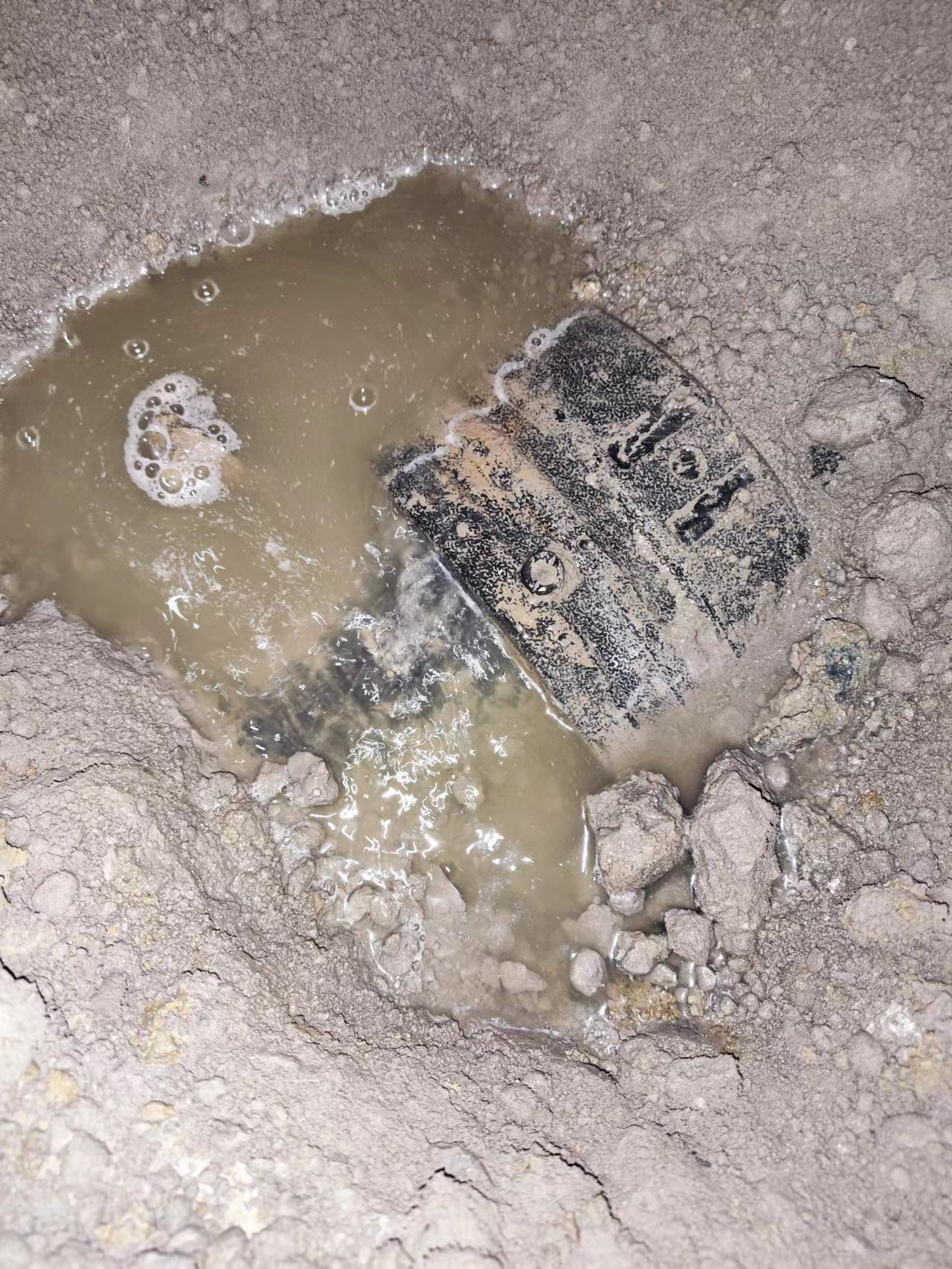 我司探漏技術組通過現場做了方案實施,取得了最終漏水檢測成果,在確定漏點位置后便組織施工隊對漏點進行開挖修復工作,開挖后發現兩處漏水點,根據漏點情況進行漏水量估算,在漏水點進行公式估算中,兩處漏水點平均一天漏水量在6方左右。(下圖)